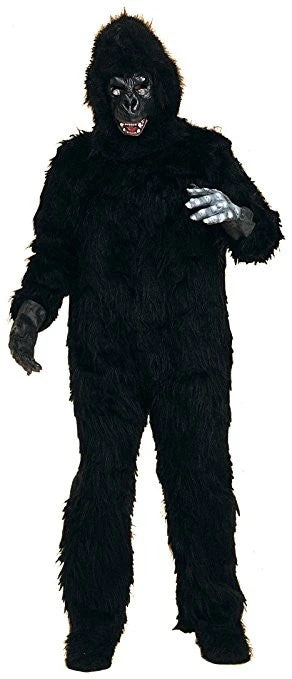 - Includes black, faux-fur jumpsuit with shoe covers, gorilla mask, gloves, and shoe covers.