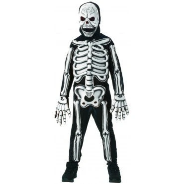 - The costume includes the “action jaw” mask with cowl, jumpsuit, and gloves with molded 3-D bones as shown.