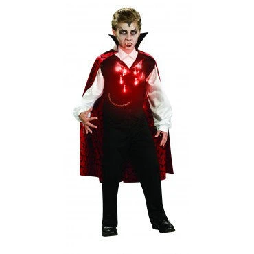 - Deluxe costume includes a shirt with attached light-up vest, long cape with stand-up collar, and pants.