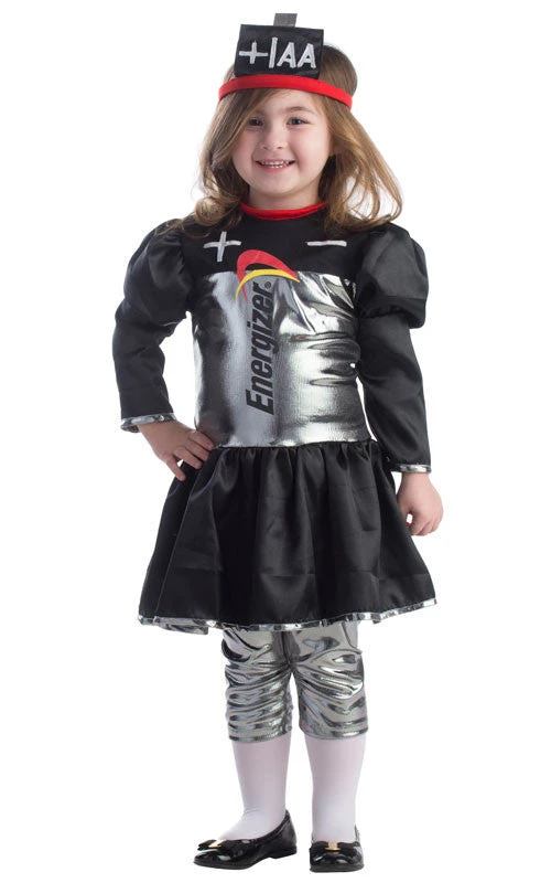 - Includes a black and silver Energizer battery dress, attached capri pants, and matching headpiece.